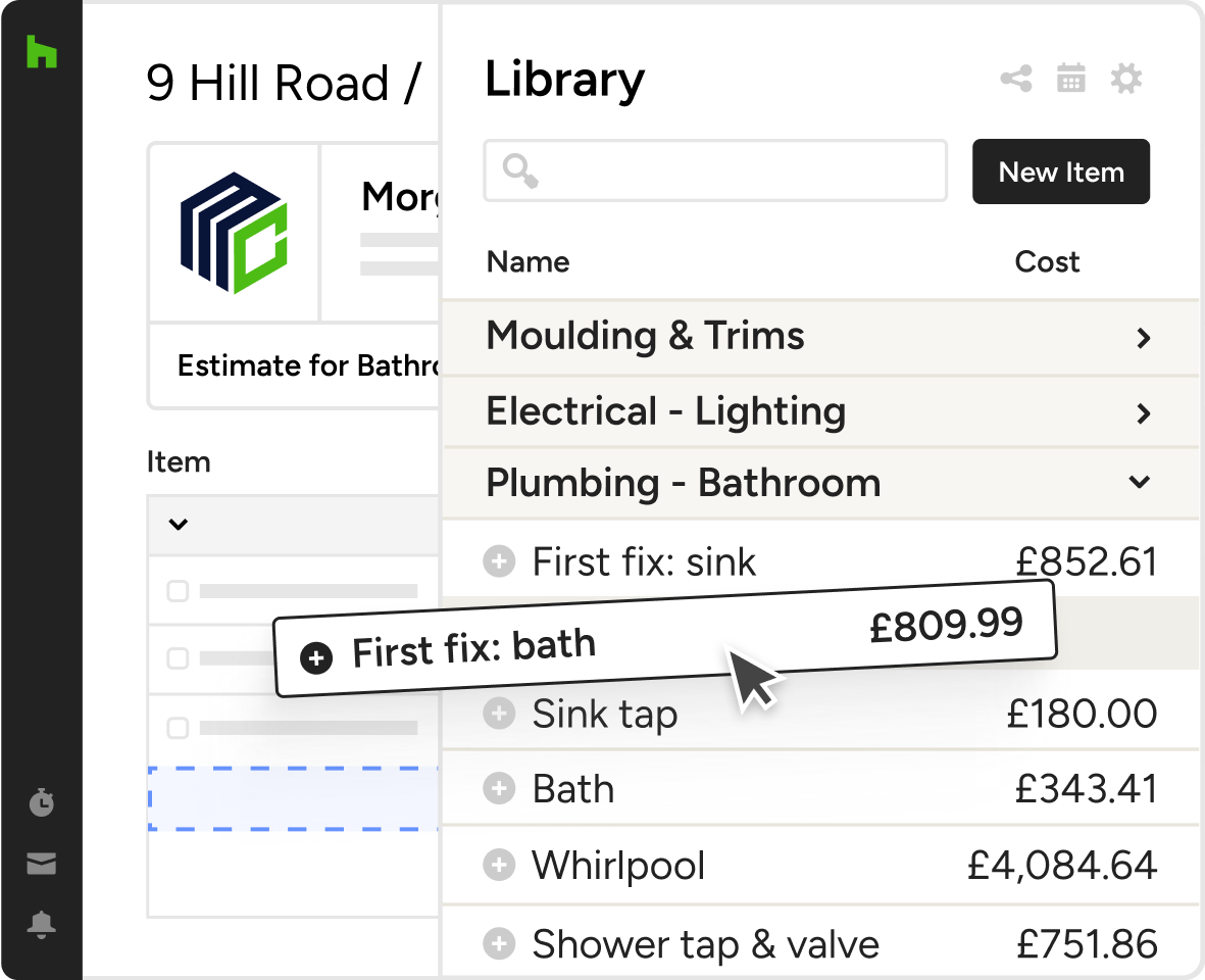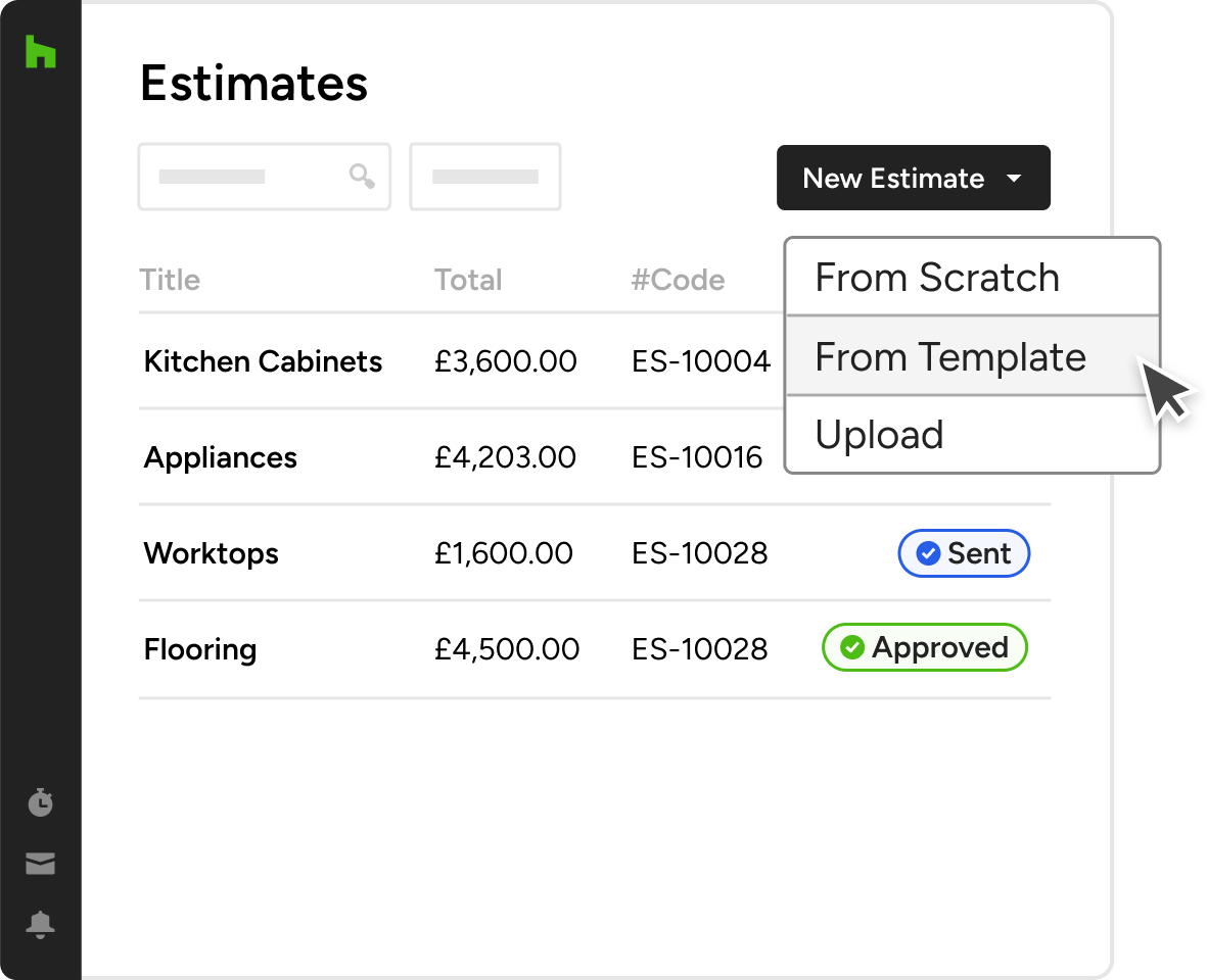 With Houzz Pro construction quote software, you can create a number of templates to have at your fingertips to make a great impression on your client. You can customise your templates as you like, adding your branding, logo, colour scheme and more, or choose to create your own template from scratch each time. From there, easily finalise your estimate by adding markups, VAT and including a clear payment schedule so your client knows what and when everything is due.
